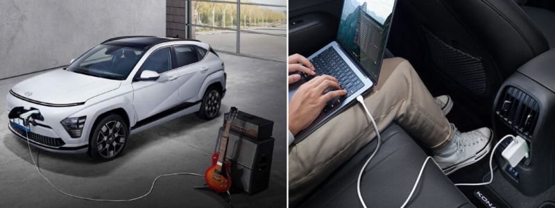 Fitur V2L memungkinkan KONA menjadi sumber daya listrik sebesar 3 kW untuk penggunaan perangkat elektronik, menambah kemudahan dan kenyamanan Anda saat dalam perjalanan.